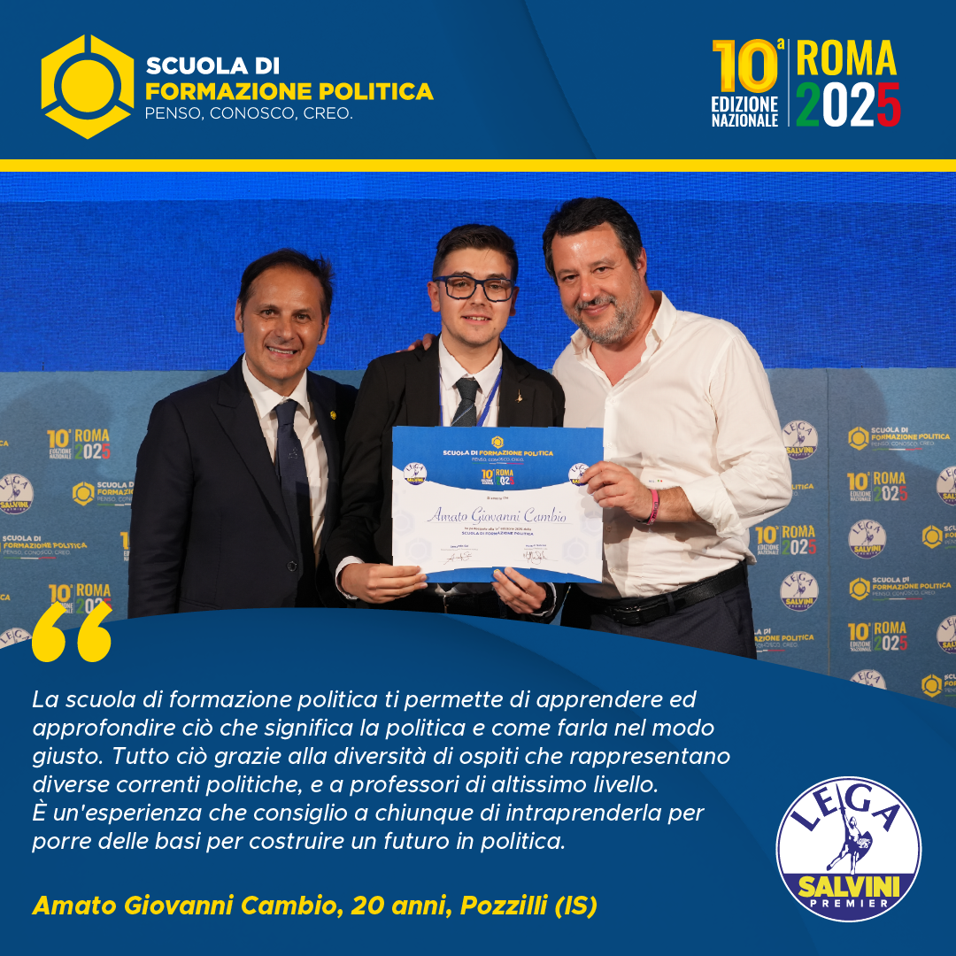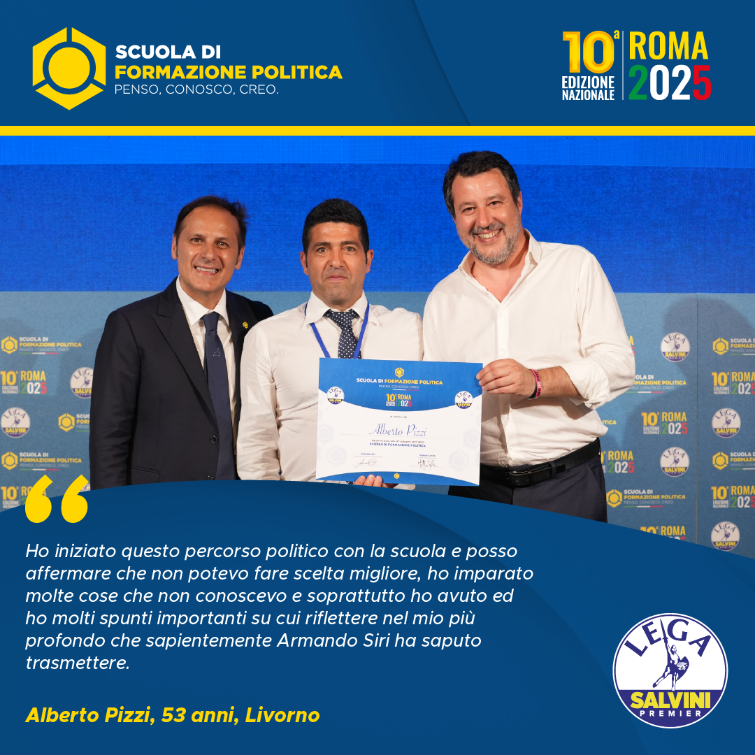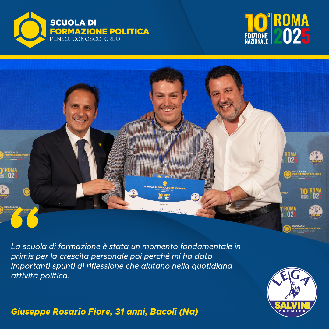 La scuola di formazione politica non è stato soltanto un luogo di conoscenza ma anche un’esperienza di vita. Penso, conosco, creo non rimarrà soltanto lo slogan di una scuola che ha ampliato i miei orizzonti culturali, ma da oggi diverrà il mio modus vivendi e cogitandi. Sono stati mesi davvero intensi, ricchi di momenti formativi e illuminanti. La squadra della lega, con a capo un grandioso Armando Siri, si è rivelata un’eccellenza nel panorama politico, sia a livello di professionalità che dal punto di vista strettamente politico. È stata un’avventura che difficilmente dimenticherò, momenti di puro ossigeno da respirare a pieni polmoni. Un percorso sicuramente utile e migliorativo che consiglierei a chiunque abbia voglia di dedicarsi al proprio paese per un ideale. Ringrazio tutto lo staff per la cortesia e la gentilezza che hanno dimostrato durante tutte le sei lezioni e che dire, grazie di tutto.