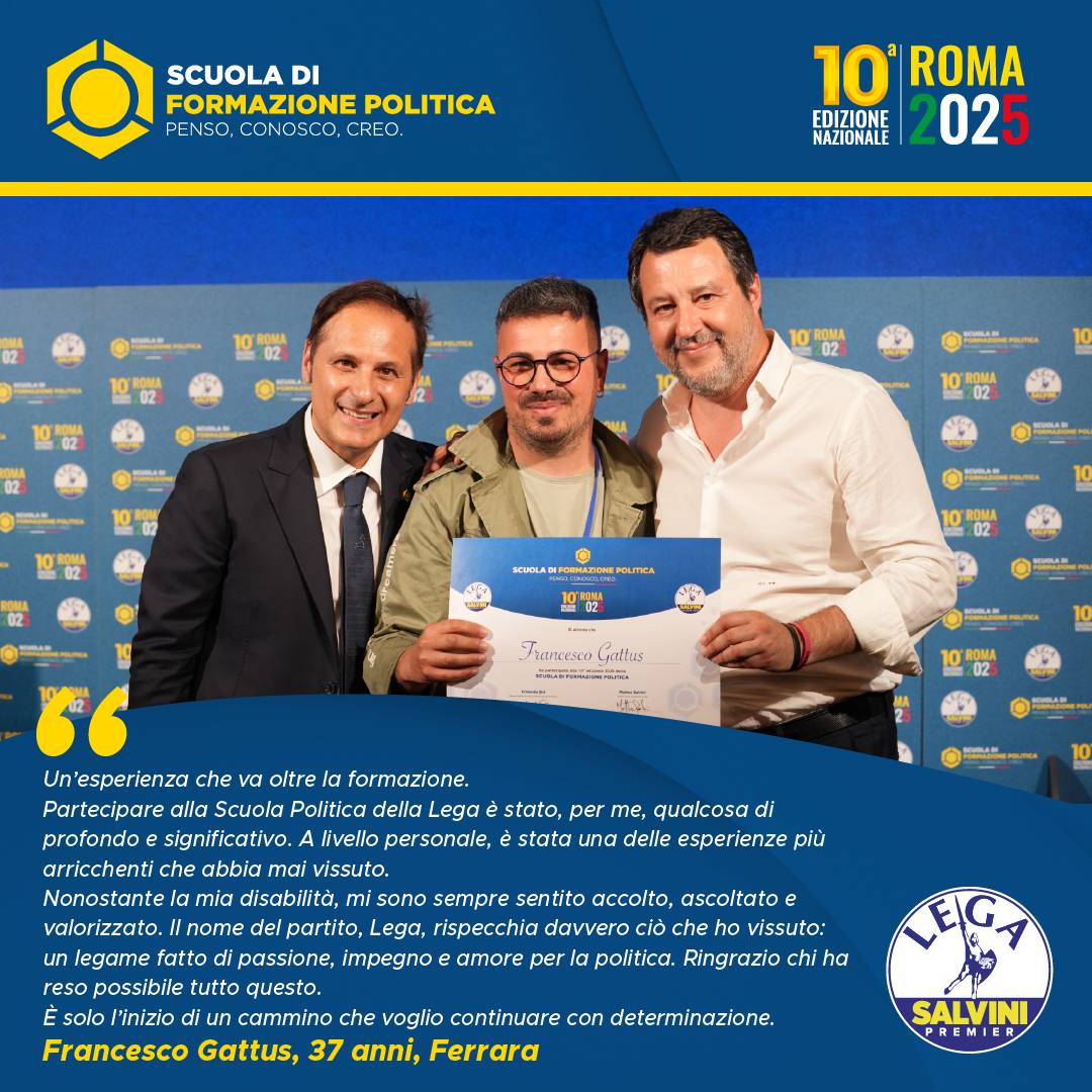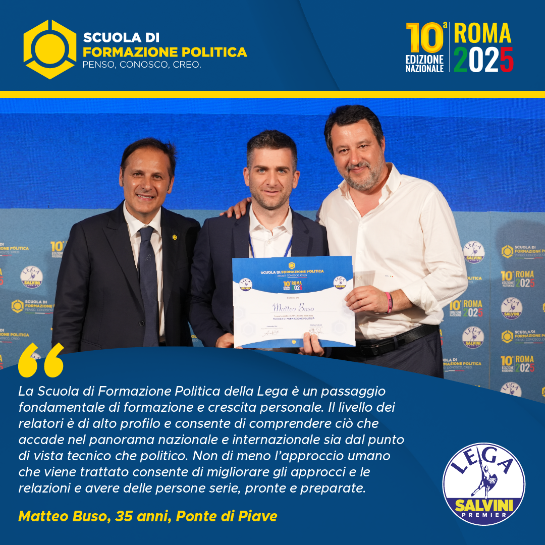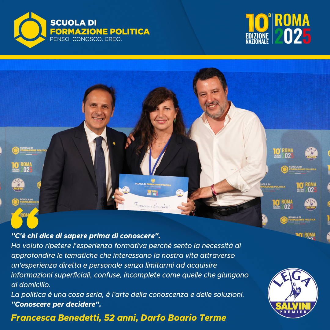 La scuola di formazione politica non è stato soltanto un luogo di conoscenza ma anche un’esperienza di vita. Penso, conosco, creo non rimarrà soltanto lo slogan di una scuola che ha ampliato i miei orizzonti culturali, ma da oggi diverrà il mio modus vivendi e cogitandi. Sono stati mesi davvero intensi, ricchi di momenti formativi e illuminanti. La squadra della lega, con a capo un grandioso Armando Siri, si è rivelata un’eccellenza nel panorama politico, sia a livello di professionalità che dal punto di vista strettamente politico. È stata un’avventura che difficilmente dimenticherò, momenti di puro ossigeno da respirare a pieni polmoni. Un percorso sicuramente utile e migliorativo che consiglierei a chiunque abbia voglia di dedicarsi al proprio paese per un ideale. Ringrazio tutto lo staff per la cortesia e la gentilezza che hanno dimostrato durante tutte le sei lezioni e che dire, grazie di tutto.