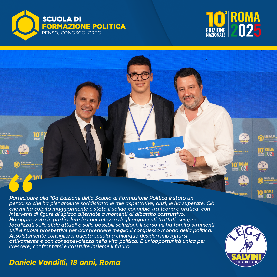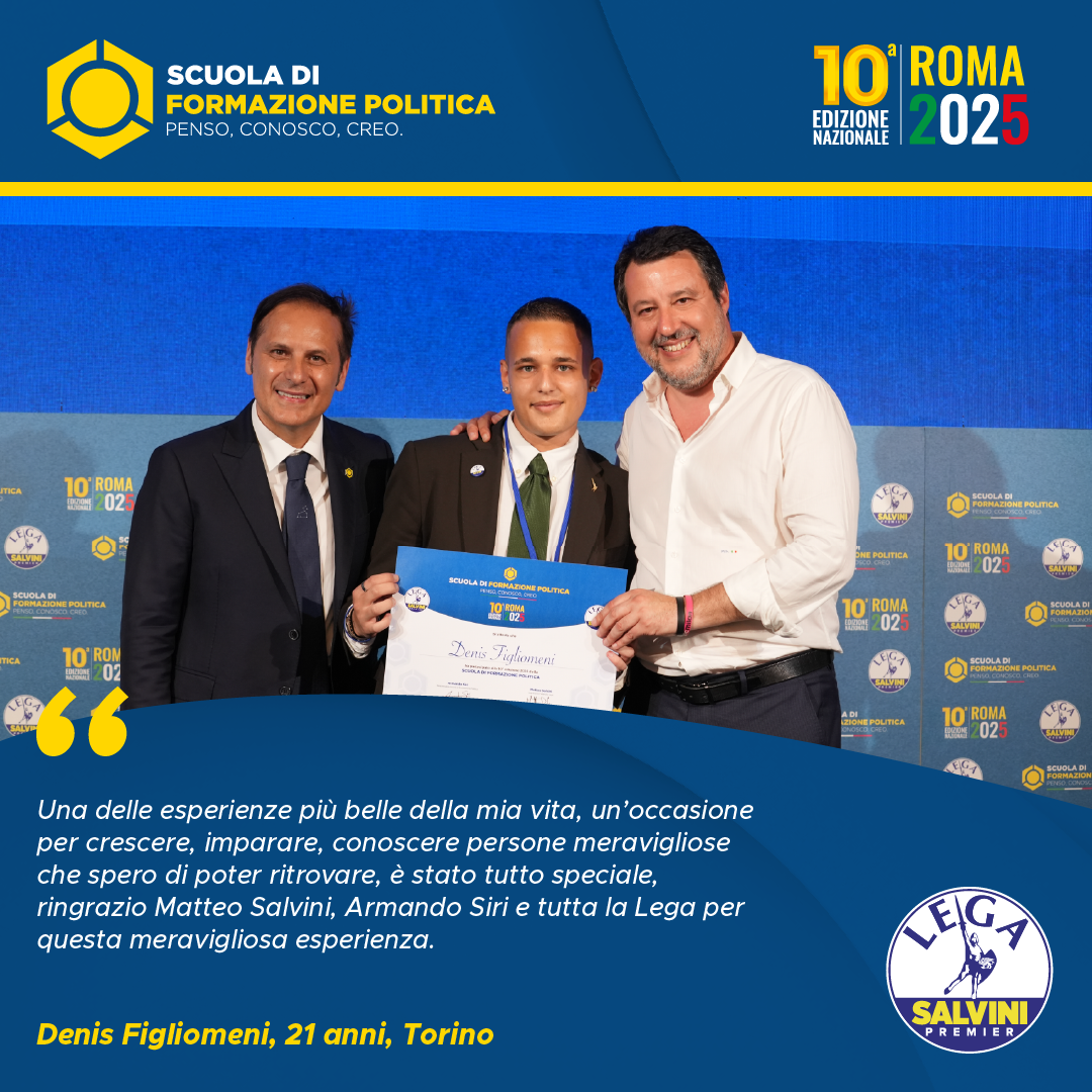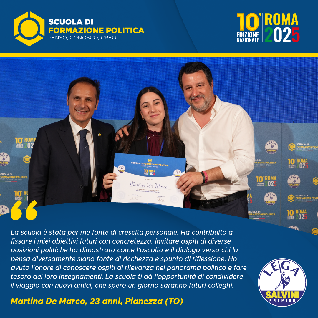 È stata una esperienza meravigliosa che mi ha permesso non solo di apprendere nuovi concetti in campo politico, ma anche di confrontarmi con gente proveniente da tutta Italia e riflettere su ciò che vogliamo e possiamo fare per cambiare lo stato attuale della politica, sia a livello nazionale che sul territorio. Tutti coloro che hanno intenzione di intraprendere una carriera politica dovrebbero passare per questa scuola di formazione. Grazie di cuore ad Armando Siri, Matteo Salvini e a tutto lo staff.